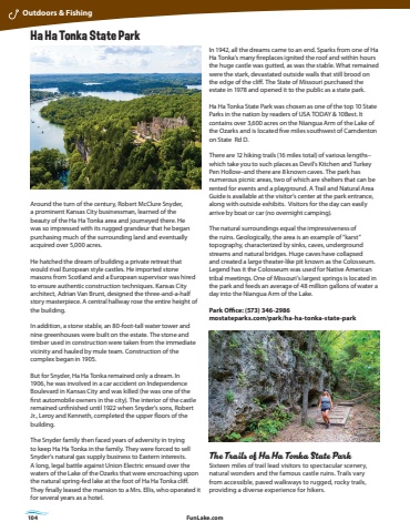 104 FunLake.comAround the turn of the century, Robert McClure Snyder, a prominent Kansas City businessman, learned of the beauty of the Ha Ha Tonka area and journeyed there. He was so impressed with its rugged grandeur that he began purchasing much of the surrounding land and eventually acquired over 5,000 acres. He hatched the dream of building a private retreat that would rival European style castles. He imported stone masons from Scotland and a European supervisor was hired to ensure authentic construction techniques. Kansas City architect, Adrian Van Brunt, designed the three-and-a-half story masterpiece. A central hallway rose the entire height of the building. In addition, a stone stable, an 80-foot-tall water tower and nine greenhouses were built on the estate. The stone and timber used in construction were taken from the immediate vicinity and hauled by mule team. Construction of the complex began in 1905.But for Snyder, Ha Ha Tonka remained only a dream. In 1906, he was involved in a car accident on Independence Boulevard in Kansas City and was killed (he was one of the first automobile owners in the city). The interior of the castle remained unfinished until 1922 when Snyder%u2019s sons, Robert Jr., Leroy and Kenneth, completed the upper floors of the building.The Snyder family then faced years of adversity in trying to keep Ha Ha Tonka in the family. They were forced to sell Snyder%u2019s natural gas supply business to Eastern interests. A long, legal battle against Union Electric ensued over the waters of the Lake of the Ozarks that were encroaching upon the natural spring-fed lake at the foot of Ha Ha Tonka cliff.They finally leased the mansion to a Mrs. Ellis, who operated it for several years as a hotel.In 1942, all the dreams came to an end. Sparks from one of Ha Ha Tonka%u2019s many fireplaces ignited the roof and within hours the huge castle was gutted, as was the stable. What remained were the stark, devastated outside walls that still brood on the edge of the cliff. The State of Missouri purchased the estate in 1978 and opened it to the public as a state park. Ha Ha Tonka State Park was chosen as one of the top 10 State Parks in the nation by readers of USA TODAY & 10Best. It contains over 3,600 acres on the Niangua Arm of the Lake of the Ozarks and is located five miles southwest of Camdenton on State Rd D. There are 12 hiking trails (16 miles total) of various lengths%u2013which take you to such places as Devil%u2019s Kitchen and Turkey Pen Hollow%u2013and there are 8 known caves. The park has numerous picnic areas, two of which are shelters that can be rented for events and a playground. A Trail and Natural Area Guide is available at the visitor%u2019s center at the park entrance, along with outside exhibits. Visitors for the day can easily arrive by boat or car (no overnight camping).The natural surroundings equal the impressiveness of the ruins. Geologically, the area is an example of %u201ckarst%u201d topography, characterized by sinks, caves, underground streams and natural bridges. Huge caves have collapsed and created a large theater-like pit known as the Colosseum. Legend has it the Colosseum was used for Native American tribal meetings. One of Missouri%u2019s largest springs is located in the park and feeds an average of 48 million gallons of water a day into the Niangua Arm of the Lake.Park Office: (573) 346-2986mostateparks.com/park/ha-ha-tonka-state-parkThe Trails of Ha Ha Tonka State ParkSixteen miles of trail lead visitors to spectacular scenery, natural wonders and the famous castle ruins. Trails vary from accessible, paved walkways to rugged, rocky trails, providing a diverse experience for hikers.Ha Ha Tonka State ParkOutdoors & Fishing