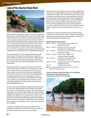 106 FunLake.comLake of the Ozarks State ParkMany Lake Area visitors don%u2019t realize a 17,441 acre playground lies just to the south of Osage Beach. Lake of the Ozarks State Park is Missouri%u2019s largest and can provide a pleasant diversion while vacationing in the Lake Area. The park has 85 miles of shoreline and two public beaches, plus boat launching areas. Lee C. Fine Memorial Airport has a 6,500 by 100 ft runway, plus terminal building, parallel taxiway, fuel and tiedown service. Hiking trails, horseback riding stable, playgrounds, picnic areas, three organized youth camps and Camp Pin Oak Lodge (used for special events such as weddings) are offered.The Grand Glaize Arm of the Lake separates the park with over 85 miles of shoreline. You will discover many of the park%u2019s facilities along this water corridor from Public Beach #1 at the end of Hwy 134 to Grand Glaize Beach (Public Beach #2) 1.5 miles south of the Grand Glaize Bridge on Hwy 54 in Osage Beach.Bring a picnic dinner to enjoy after swimming at the free sand beaches found in both areas. For large groups, reserve a picnic shelter for a fee to guarantee its use or take your chances and use it on a first-come, first-serve basis when not reserved. Launch your own boat at the available ramps (minimal launching fee at Grand Glaize Beach, Pa He Tsi, and Public Beach #1; free launch at McCubbins Point). Rent a boat at PB#1 and Grand Glaize Beach. Fish from a dock with crappie beds for no charge, as long as you have the appropriate fishing license!Discover unusual natural features along the park%u2019s lakeshore on Lake of the Ozarks Aquatic Trail. (See map on page 60.) This unique %u201ctrail%u201d, designed for boaters, has stops marked by buoys that cover over nine miles of the Lake. A free booklet explaining the significance of each of the 14 marked shoreline highlights is available at the park office. Naturalists present programs in an open air amphitheater about natural features found in Missouri%u2019s state parks. Guided hikes and a variety of other programs are provided, as well. Contact the park offices for a schedule.Camping is available inside the park at more than 220 campsites, ranging from primitive to full electric. There are also eight camper cabins and two yurts available. Many Lake visitors escape the summer%u2019s heat by exploring 56%u00b0 Ozark Caverns. Follow Highway A (between Osage Beach and Camdenton) for eight miles and follow the signs. After paying a small fee, hand held lanterns are provided which enhance the sense of discovering a whole new world of underground beauty. The spectacular Angel Shower, a never-ending flow of water which seems to fall from the solid ceiling of rock into massive bowl shaped stone basin on the cave floor, is one of the many features pointed out by your guide. Unusual animals, adapted to this world of darkness, can be seen, as well.Ozark Caverns Visitor Center helps visitors understand the ecosystems found in Missouri%u2019s caves. Traditional, Speleology (advanced) and Children%u2019s Tours are available; call ahead to arrange Speleology or Children%u2019s Tours. Ozark Caverns Hours & FeesApr 15 %u2013 Oct 15: School group tours available by appointment only.May 15 %u2013 May 31: Tours are at 11am; 1pm; 3pm Saturday and Sundays OnlyJun 1 %u2013 Aug 15: Tours are at 11am; 12:30pm; 2pm; 4pmSeven Days a WeekAug 16 %u2013 Aug 31: Tours are at 12:30pm; 2pm Tuesday through SaturdaySep 1%u2013 Sep 15: tours are at 11 am; 1pm; 3pm Saturday and Sunday onlySep 16 - Oct 15: School group tours are available by appointment onlyOct 16: Closed for the season. Fee: 5 yrs and Under Free; 6-12yrs $6; 13-17yrs $8; Adults (18 and over) $10Lake of the Ozarks State Park Office: (573) 348-2694mostateparks.com/lakeozark.htmOzark Caverns Office: (573) 346-2500Outdoors & Fishing