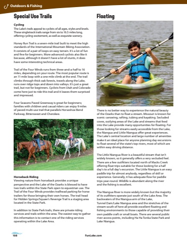 108 FunLake.comRocky Top Trail FloatingThere is no better way to experience the natural beauty of the Ozarks than to float a stream. Missouri is known for scenic canoeing, rafting, tubing and kayaking. Secludedcoves, outlying areas of the Lake and streams that feed into the Lake provide many opportunities for floating. For those looking for streams easily accessible from the Lake, the Niangua and Little Niangua offer great experiences. The Lake%u2019s central location and large number of amenities make it an ideal place for anyone planning day excursions to float several of the state%u2019s top rivers, most of which are within easy driving distance.The Little Niangua River is a beautiful stream that isn%u2019t widely known, so it generally offers a very secluded feel. There are a few outfitters located north of Macks Creek offering float trips suitable for those looking for a half day%u2019s to a full day%u2019s excursion. The Little Niangua is an easy paddle trip for almost anybody, regardless of skill or experience. Generally, it has adequate flow for paddle trips year-round. Wildlife is abundant along the river and the fishing is excellent. The Niangua River is more widely known but the majority of its outfitters operate just south of the Lake Area. The backwaters of the Niangua arm of the Lake, Tunnel Dam/Lake Niangua area and the stretches of the stream south of here all provide excellent floating and fishing environments to those capable of providing their own paddle craft or small boats. There are several public river access points, including Ha Ha Tonka State Park and Lake Niangua.Special Use TrailsCyclingThe Lake%u2019s trails appeal to cyclists of all ages, styles and levels. These singletrack trails range from six to 16.5 miles long, offering cycling excitement, as well as exquisite scenery.Honey Run Trail is a seven-mile trail built to meet the high standards of the International Mountain Biking Association. It consists of a pair of loops on easy terrain. It%u2019s a lot of fun and fine for beginners. More advanced cyclists also like it because, although it doesn%u2019t have a lot of stunts, it does have some interesting technical areas.Trail of the Four Winds runs from three-and-a-half to 16 miles, depending on your route. The most popular route is an 11-mile loop with a one mile climb at the end. The trail climbs through thick oak forests, travels along the Lake, runs over ridge tops and down into valleys. It%u2019s just a great trail, but not for beginners. Cyclists from Utah and Colorado come here just to ride this trail and it leaves them surprised and impressed.Four Seasons Paved Greenway is great for beginners; families with children and casual riders can enjoy 9 miles of paved multi-use trail that parallels Horseshoe Bend Parkway, Bittersweet and Cherokee.Horseback RidingViewing nature from horseback provides a unique perspective and the Lake of the Ozarks is blessed to have two trails within the State Park open to equestrian use. The Trail of the Four Winds provides trailhead parking for horse trailers for those bringing their own horses. The trail head for Hidden Springs/Squaw%u2019s Revenge Trail is a staging area located in the State Park.In addition to State Park trails, there are private riding services and trails within the area. The easiest way to gather this information is to contact one of the riding services operating within the Lake Area. Outdoors & Fishing