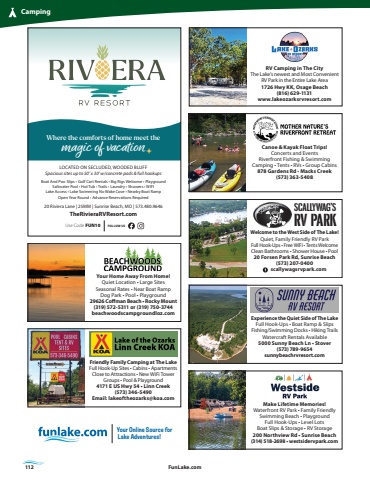 112 FunLake.comCampingLOCATED ON SECLUDED, WOODED BLUFFSpacious sites up to 50%u2019 x 30%u2019 w/concrete pads & full hookupsBoat And Pwc Slips %u2022 Golf Cart Rentals %u2022 Big Rigs Welcome %u2022 PlaygroundSaltwater Pool %u2022 Hot Tub %u2022 Trails %u2022 Laundry %u2022 Showers %u2022 WIFILake Access %u2022 Lake Swimming No Wake Cove %u2022 Nearby Boat RampOpen Year Round %u2022 Advance Reservations Required20 Riviera Lane | 25MM | Sunrise Beach, MO | 573.480.9646 TheRivieraRVResort.comWhere the comforts of home meet the magic of vacationFOLLOW USLOCATED ON SECLUDED, WOODED BLUFFSpacious sites up to 50%u2019 x 30%u2019 w/concrete pads & full hookupsBoat And Pwc Slips %u2022 Golf Cart Rentals %u2022 Big Rigs Welcome %u2022 PlaygroundSaltwater Pool %u2022 Hot Tub %u2022 Trails %u2022 Laundry %u2022 Showers %u2022 WIFILake Access %u2022 Lake Swimming No Wake Cove %u2022 Nearby Boat RampOpen Year Round %u2022 Advance Reservations Required20 Riviera Lane | 25MM | Sunrise Beach, MO | 573.480.9646 TheRivieraRVResort.comWhere the comforts of home meet the magic of vacationUse Code FUN10 FOLLOW USRV Camping in The CityThe Lake%u2019s newest and Most ConvenientRV Park in the Entire Lake Area1726 Hwy KK, Osage Beach(816) 629-1131www.lakeozarksrvresort.comExperience the Quiet Side of The LakeFull Hook-Ups %u2022 Boat Ramp & Slips Fishing/Swimming Docks %u2022 Hiking TrailsWatercraft Rentals Available 5000 Sunny Beach Ln %u2022 Stover(573) 789-9654sunnybeachrvresort.comWelcome to the West Side of The Lake!Quiet, Family Friendly RV ParkFull Hook-Ups %u2022 Free WiFi %u2022 Tents WelcomeClean Bathrooms %u2022 Shower House %u2022 Pool20 Forsen Park Rd, Sunrise Beach(573) 207-0400 scallywagsrvpark.comSCALLYWAG%u2019SRV PARKFriendly Family Camping at The LakeFull Hook-Up Sites %u2022 Cabins %u2022 Apartments Close to Attractions %u2022 New WiFi TowerGroups %u2022 Pool & Playground4171 E US Hwy 54 %u2022 Linn Creek(573) 346-5490Email: lakeoftheozarks@koa.comYour Online Source for Lake Adventures!Make Lifetime Memories!Waterfront RV Park %u2022 Family FriendlySwimming Beach %u2022 PlaygroundFull Hook-Ups %u2022 Level LotsBoat Slips & Storage %u2022 RV Storage200 Northview Rd %u2022 Sunrise Beach(314) 518-2698 %u2022 westsidervpark.comCanoe & Kayak Float Trips!Concerts and EventsRiverfront Fishing & Swimming Camping %u2022 Tents %u2022 RVs %u2022 Group Cabins878 Gardens Rd %u2022 Macks Creek(573) 363-5408Your Home Away From Home!Quiet Location %u2022 Large Sites Seasonal Rates %u2022 Near Boat RampDog Park %u2022 Pool %u2022 Playground29626 Coffman Beach %u2022 Rocky Mount(319) 572-5311 or (319) 750-3744beachwoodscampgroundloz.com