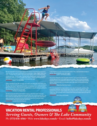 118 FunLake.comPh: (573) 836-6566 %u2022 Web: www.lakedays.rentals %u2022 Email: hello@lakedays.rentalsServing Guests, Owners & fi e Lake CommunityWe had a wonderful stay at Eagle Ridge in the Ozarks! Everything was exactly as listed and the house was stocked with all the essentials%u2014coff ee, towels, linens, and more. The team was incredibly responsive and friendly, which made everything smooth and easy. The dock was a highlight with a fl oating pad, kayak, and paddle board that made our time on the water even better. Overall, a great experience%u2014we%u2019d defi nitely come back and highly recommend this stay!%u2013 Ryan K. at Eagle RidgeAlways a wonderful stay! We%u2019ve stayed here before and absolutely love it each time we visit. From the stunning views of the lake to the beauty of the condo everything is amazing and perfect. They have everything you need! We made use of the games with our kids. Would recommend this beautiful place to anyone and we would love to stay here again when we%u2019re in this area! %u2013 Brandy A. at Happy DazeWonderful place for family and friends! Gorgeous view of the lake! There was plenty of space outdoors and everything was taken care of before we arrived. The host made sure there was plenty of supplies and the house was clean. Wonderful place to stay with friends and family and plenty of room for the whole Family! Communication with the host was fast and timely! %u2013 Jennifer M at Rum RunnerA stay that felt just right! The house was perfect! Very clean and easy to check in and out. Would defi nitely stay there again! %u2013 Tyler H. at Fireside LandingThis condo is beautiful, with thoughtful touches, and as pictured. Beds were comfortable and linens and towels were good quality. It was nicely stocked with essentials that you normally don%u2019t fi nd in a rental. These are also listed in listing details. Condo faces west so screened in porch was great until late a%u0093 /evening. Very nice spot. %u2013 Mary M. at Soul Star SunsetThis home exceeded my expectations in every way. It%u2019s beautiful, spotless, and loaded with amenities, with peaceful lake views from almost every room. The spacious living areas made it perfect for our whole family, and the secluded location made it feel like a private retreat. We all loved it and are already looking forward to coming back! %u2013 Terry W. at LOTO PointeVACATION RENTAL PROFESSIONALS