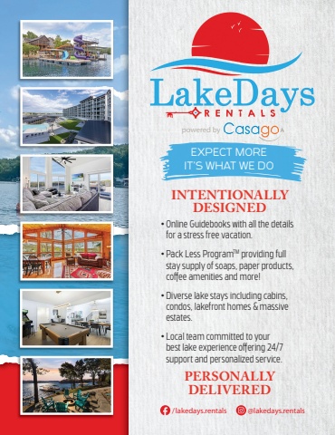 FunLake.com FunLake.com 119EXPECT MOREIT%u2019S WHAT WE DO/lakedays.rentals @lakedays.rentalsINTENTIONALLY DESIGNEDPERSONALLY DELIVERED%u2022 Online Guidebooks with all the details for a stress free vacation.%u2022 Pack Less ProgramTM providing full stay supply of soaps, paper products, coff ee amenities and more!%u2022 Diverse lake stays including cabins, condos, lakefront homes & massive estates.%u2022 Local team committed to your best lake experience off ering 24/7 support and personalized service.powered by