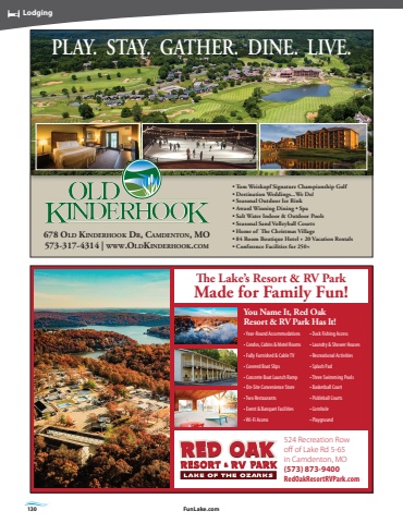 130 FunLake.comLodging%u2022 Year-Round Accommodations%u2022 Condos, Cabins & Motel Rooms%u2022 Fully Furnished & Cable TV%u2022 Covered Boat Slips%u2022 Concrete Boat Launch Ramp%u2022 On-Site Convenience Store%u2022 Two Restaurants%u2022 Event & Banquet Facilities%u2022 Wi-Fi Access%u2022 Dock Fishing Access%u2022 Laundry & Shower Houses%u2022 Recreational Activities%u2022 Splash Pad%u2022 Three Swimming Pools%u2022 Basketball Court%u2022 Pickleball Courts%u2022 Cornhole%u2022 Playground524 Recreation Row ofi of Lake Rd 5-65in Camdenton, MO(573) 873-9400RedOakResortRVPark.comYou Name It, Red Oak Resort & RV Park Has It!fi e Lake%u2019s Resort & RV Park Made for Family Fun! 678 OLD KINDERHOOK DR, CAMDENTON, MO573-317-4314 | WWW.OLDKINDERHOOK.COMPLAY. STAY. GATHER. DINE. LIVE.%u2022 Tom Weiskopf Signature Championship Golf%u2022 Destination Weddings...We Do!%u2022 Seasonal Outdoor Ice Rink%u2022 Award Winning Dining %u2022 Spa%u2022 Salt Water Indoor & Outdoor Pools%u2022 Seasonal Sand Volleyball Courts%u2022 Home of fi e Christmas Village%u2022 84 Room Boutique Hotel + 20 Vacation Rentals%u2022 Conference Facilities for 250+