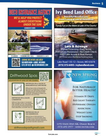 FunLake.com FunLake.com 147BusinessIvy Bend Land OfficeFamily Fun on the Water at Lake of the Ozarks!Beautiful Wooded LotsGreat Fishing & Lots of Relaxation Lots & AcreageOwner Financing %u2022 Easy TermsImmediate Possession %u2022 No Credit CheckFREE Lake Access & Boat RampsMO Conservation Boat Ramp/Handicap RampLake Road 135-12 %u2022 Stover, MO 65078(573) 372-6493 %u2022 ivybendland.comSERVING THE ENTIRE LAKE AREA!508 NORTH MAIN %u2022 LAURIE, MISSOURI(573) 207-0225 DECOINSURANCE.COMDECO INSURANCE AGENCYWE%u2019LL HELP YOU PROTECT ALMOST EVERYTHING UNDER THE SUN!FLOOD %u2022 COMMERCIAL %u2022 UMBRELLASLICENCED IN 11 STATESFor Naturally Better Health!Vitamin IV DripsRed Light TherapyHyperbaric OxygenAddictionWeight LossStop Smoking 1193 State Hwy KK, Osage Beach(573) 693-1977 %u2022 nswcenter.com