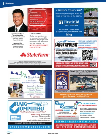 148 FunLake.comBusiness995 KK Drive | Osage Beach(573) 302-1117 | www.firstmid.comFinance Your Fun!We%u2019re ready to help you make the most of your time in the Ozarks.6368 Osage Beach Pkwy, Osage Beach(573) 693-9949 %u2022 mcsrental.comLocally Owned / Competitive Prices / Delivery AvailableHeavy Equipment Rental From Bobcats to excavators, you%u2019ll fi nd what you%u2019re looking for.COME SEE THE DIFFERENCEHEATING & COOLING, INC.LICENSED & INSUREDSERVING THE LAKE SINCE 1998S E R V I C E %u2022 S A L E S %u2022 I N S T A L L A T I O N LOCATED IN CAMDENTON %u2022 SERVING THE ENTIRE LAKE AREA(573) 873-5300 %u2022 ROADRUNNERHC.COM THE ONES TO TRUST...JUST ASK YOUR NEIGHBORS!RESIDENTIAL & COMMERCIALA/C %u2022 Furnaces %u2022 Heat PumpsMITSUBISHI MINI-SPLITS New Homes %u2022 Add-ons Service All Makes & Models %u2013 FREE ESTIMATES ON REPLACEMENTS %u2013Over 46 years experience in custom sheet metal work!Having one special person for your car, home and life insurance lets you get down to business with the rest of your life. It%u2019s what I do.GET TO A BETTER STATE%u2122.CALL ME TODAY.Look no further.1101201.1State Farm Mutual Automobile Insurance Company, State Farm Indemnity Company, State Farm Fire and Casualty Company, State Farm General Insurance Company, Bloomington, ILDEPENDABLE and KNOWLEDGEABLEagent seeks customers looking for real PROTECTION and long term RELATIONSHIP.SINGLE, ARTSY LADY SEEKS SINGLE ARTSY GUY. If you love painting, decorating, baking and energetic lady. Must love kids, be fit and ready to jump in and join the fun. Military training would be helpful.ADVENTUROUS CAT LOVER seeks adventurous cat owner. Please be employed and willing to relocate. Especially fond of black and white tuxedo cats. All responses will be answered. Looking for that Purrr-fect match. GRANOLA EATING, CAMP LOVING, WORLD TRAVELER seeks woman of my dreams.Must be fit and love spending days and nights outdoors in the middle of Sykora Insurance Agcy IncMarcus Sykora, Agent3570 Osage Beach PkwyOsage Beach, MO 65065Bus: 573-365-5088Sykora Insurance Agcy IncMarcus Sykora, Agent3535 Osage Beach Pkwy, Ste 401Osage Beach, MO 65065Phone: 573-365-5088Camdenton Ofi ce494 North Business Route 5Camdenton, MO 65020Phone: 573-346-5920YOUR LOCAL LAKE AREA WATER CONDITIONING SPECIALISTS FOR OVER 30 YEARS!SERVING THE ENTIRE LAKE OF THE OZARKS AREA(573) 348-5044 | LINDYSPRINGLAKEOFTHEOZARKS.COMA FAMILY OWNED & OPERATED LOCAL BUSINESSRESIDENTIAL & COMMERCIAL Sales, Rental & Service%u2022 Water Softeners %u2022 Salt Deliveries%u2022 RO Drinking Water Systems%u2022 Filters %u2022 Free Water Analysis%u2022 Service All Makes & Models%u2022 Bottled Water Deliverycraigcomputers.comTodd Craig, technologist 309 East 3rd Street, Eldon(573) 392-0392email: todd@craigcomputers.comMicrosoft Certified Systems Engineer