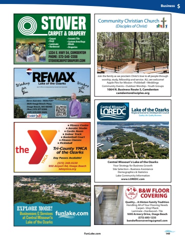FunLake.com FunLake.com 149BusinessJoin the family as we proclaim Christ%u2019s love to all people through worship, study, fellowship and service. ALL are welcome!Apple Pies for Mission %u2022 Pickleball %u2022 WeddingsCommunity Events %u2022 Outdoor Worship %u2022 Youth Groups1064 N. Business Route 5, Camdenton camdentondisciples.orgCommunity Christian Church(Disciples of Christ)Quality... A Hinton Family TraditionHandling All of Your Flooring NeedsCarpet %u2022 Vinyl PlankLaminate %u2022 Hardwood %u2022 Tile 1095 Armory Drive, Osage Beach(573) 693-1235bandwfloorcovering@gmail.comLake of the Ozarks Each Office Is Independently Owned And OperatedGene Azarskis - REALTOR%u00ae3525 Osage Beach Pkwy Osage Beach, MO 65065 (Bus.) 573-577-3346 (Off.) 573-302-3625 WorkingforYouWorkingwithYouSTOVER CARPET & DRAPERY%u2022 Carpet%u2022 Vinyl%u2022 Laminate%u2022 Hardwood1334 E. HWY 54, CAMDENTONPHONE: 573-346-2208 STOVERCARPETDRAPERY.COM%u2022 Ceramic Tile%u2022 Custom Area Rugs%u2022 Blinds%u2022 DraperiesCentral Missouri%u2019s Lake of the OzarksYour Strategy for Business GrowthSite Selection %u2022 Business Assistance Demographics & StatisticsLake Community Informationwww.LOREDC.comExplore More! Businesses & Services at Central Missouri%u2019s Lake of the Ozarks
