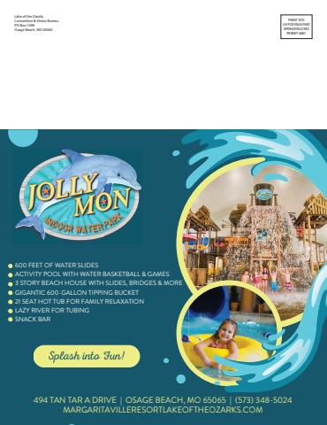 Lake of the OzarksConvention & Visitor BureauPO Box 1498Osage Beach, MO 65065 PRSRT STDUS POSTAGE PAIDSPRINGFIELD MOPERMIT #801Splash into Fun!494 TAN TAR A DRIVE | OSAGE BEACH, MO 65065 | (573) 348-5024MARGARITAVILLERESORTLAKEOFTHEOZARKS.COM600 FEET OF WATER SLIDESACTIVITY POOL WITH WATER BASKETBALL & GAMES3 STORY BEACH HOUSE WITH SLIDES, BRIDGES & MOREGIGANTIC 600-GALLON TIPPING BUCKET21 SEAT HOT TUB FOR FAMILY RELAXATIONLAZY RIVER FOR TUBINGSNACK BARMO 65065 | (573) 348-5024FTHEOZARKS.COM