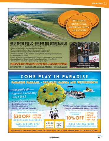 FunLake.com FunLake.com 29Attractions MISSOURI TRAPSHOOTERS ASSOCIATION(573) 346-2449 %u2022 51 Trapshooters Rd, Linn Creek, MO 65052 %u2022 www.motraps.comOPEN TO THE PUBLIC %u2022 FUN FOR THE ENTIRE FAMILY!Never shot a clay target? Give trapshooting a try. We have everything you need.%u2022 Open to The Public - No Membership Required%u2022 Free Instruction, loaner gun and necessary equipment.%u2022 Shoot as much as you want. Ammunition sold on site.%u2022 Clubhouse (6000 sq. ft.), Kitchen, Dining Room, Meeting/Activity Room.%u2022 329 Improved RV Spots.%u2022 Great facility for corporate outings, groups, charity events and reunions.%u2022 Located South of Osage Beach, 6 miles East of Hwy 54 on Rte. A.%u2022 Hours: Wed %u2013 Sat, 9am %u2013 5pm; Sunday, 12pm %u2013 5pmVISIT MTA to SHOOT TRAP, SPORTING CLAYS and 5-STANDSporting Clays on our 12-Station Blackberry Ridge Course%u2022 FLY WITH uscg licensed captains%u2022 EnJOY BREathtaking views%u2022 fun for ages 5 and up%u2022 PHOTO / gopro video packagescome play in paradiseTritoon Boat Rentals %u2022 Jet Skis / waverunnersStand Up Paddle Boards %u2022 kayaks %u2022 Gas Dock1100 BAGNELL DAM BLVD, LAKE OZARK, MO 65049 %u2022 ON THE %u201c0%u201d MILE MARKER NEXT TO THE BAGNELL DAMMissouri%u2019s #1 Parasail CompanySince 1983for six $30 OFF peopleo r G E T $ 5 o f f p e r p e r s o nMENTION THIS COUPON TO RECEIVE10% OFFJET SKI, KAYAK AND SUPRENTALSMENTION THIS COUPON TO RECEIVECALL 573-365-6757 CALL 573-745-0700PARADISEPARASAIL.COM PARADISEMARINAANDWATERSPORTS.COMPARADISE PARASAIL %u2022 PARADISE MARINA AND WATERSPORTSMENTION THIS AD TO RECEIVE MENTION THIS AD TO RECEIVEPARADISEPARASAILMO.COM