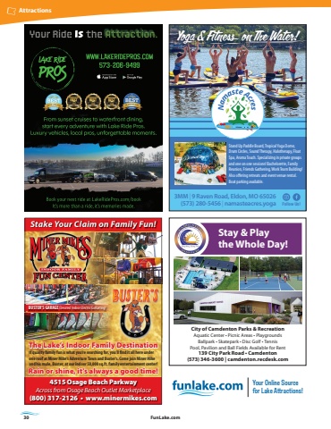 30 FunLake.comAttractionsCity of Camdenton Parks & Recreation Aquatic Center %u2022 Picnic Areas %u2022 PlaygroundsBallpark %u2022 Skatepark %u2022 Disc Golf %u2022 TennisPool, Pavilion and Ball Fields Available for Rent139 City Park Road %u2022 Camdenton(573) 346-3600 | camdenton.recdesk.com Stay & Play the Whole Day!Your Online Source for Lake Attractions!4515 Osage Beach ParkwayAcross from Osage Beach Outlet Marketplace(800) 317-2126 %u2022 www.minermikes.comRain or shine, it%u2019s always a good time!Stake Your Claim on Family Fun!If quality family fun is what you%u2019re searching for, you%u2019ll fi nd it all here under one roof at Miner Mike%u2019s Adventure Town and Buster%u2019s. Come join Miner Mike and his mule, Buster, at our indoor 50,000 sq.ft. family entertainment center! The Lake%u2019s Indoor Family DestinationBUSTER%u2019S GARAGE Elevated Indoor Electric GoKarting!Follow Us!3MM | 9 Raven Road, Eldon, MO 65026(573) 280-5456 | namasteacres.yogaYoga & Fitness on The Water!Stand Up Paddle Board, Tropical Yoga Dome, Drum Circles, Sound Therapy, Halotherapy, Float Spa, Aroma Touch. Specializing in private groups and one on one sessions! Bachelorette, Family Reunion, Friends Gathering, Work Team Building! Also ofi ering retreats and event venue rental. Boat parking available.