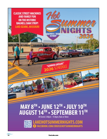 38 FunLake.com FunLake.comFACEBOOK.COM/CRUISEHOTSUMMERNIGHTSMAY 8TH %u2022 JUNE 12TH %u2022 JULY 10THAUGUST 14TH %u2022 SEPTEMBER 11THAll Events 5:00pm %u2013 9:30pm; Rain or ShineCLASSIC STREET MACHINES AND FAMILY FUN ON THE HISTORIC BAGNELL DAM STRIP!LAKE OZARK, MISSOURI2026%u201cSUMMER DREAMS%u201d2026 SCHEDULELAKEHOTSUMMERNIGHTS.COM