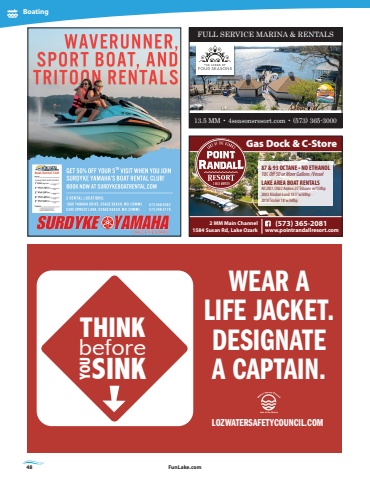 48 FunLake.comBoating13.5 MM %u2022 4seasonsresort.com %u2022 (573) 365-3000FULL SERVICE MARINA & RENTALSbeforeTHINK YOSINK UWEAR A LIFE JACKET.DESIGNATE A CAPTAIN.LOZWATERSAFETYCOUNCIL.COM (573) 365-2081www.pointrandallresort.comGas Dock & C-Store87 & 93 OCTANE %u2022 NO ETHANOL10%u00a2 Ofi 50 or More Gallons /VesselLAKE AREA BOAT RENTALSAll 2021/2022 Avalon 25%u2019 Tritoons w/150hp2003 Alaskan Lund 18.5%u2019 w/60hp2018 Tracker 18%u2019 w/60hp2 MM Main Channel1584 Susan Rd, Lake Ozark