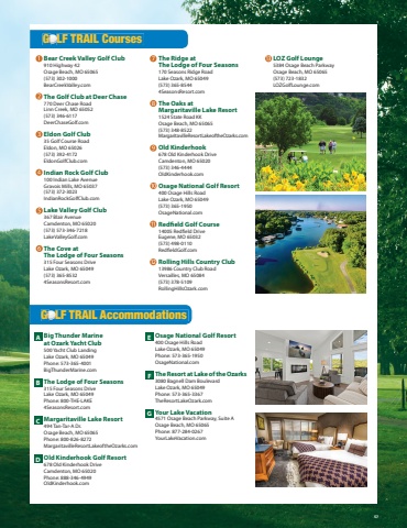 FunLake.com FunLake.com 57VISIT US ONLINE ATLakeOfTheOzarksGolfTrail.com OR CALL TOLL-FREE800-490-8474G LF TRAIL CoursesG LF TRAIL AccommodationsWith 12 challenging by world-renowned designers %u2026 awe,inspiring views %u2026 and comfortable and convenient accommodations set against the breathtaking canvas of our sparkling lake and the rolling hills of the Ozarks %u2026 don%u2019t you think it%u2019s time YOU hit the Trail?%u201dCamdentonMemorialAirport1 2 3 46 578910123456789 103031323334353639 374041 42434445464749 485051525354 5556575859606162636465663811 12 13 14 1516171820 2123 222425262729 2819123 45 6 7891011121314 2 1341235 4675678 9 101112131415 16Lee C. FineMemorialAirport13454545WDDDHH HHWWWZZZWWW AAAAWWWDYYYYYYY5513513513513513513555255552 5252525252525277777777555545442KK 42KKKKYAAA AAEEEBBBBAYVVVDDDDAAAAAAJO U WNNNNNNNNOJJJZZ F TTTTMM MMMMFFOO OP PTTTTTT MMMMMMJJJJTTTTTW134134Horseshoe Bend PkwyO dl Hwy 5EELowellWilliamsRdOsage Beach Pkwy242Old Hwy 5Old Hwy 5Lake of the OzarksState ParkEldonSunriseBeachLinnCreekCamdentonMacks CreekLaurieHa Ha TonkaState ParkGravoisMillsVersaillesStoverLake of the OzarksGravois ArmOsage RiverGrand GlaizeBridgeCommunity BridgeBagnell DamNianguaBridgeGrand Glaize,Osage Beach AirportKACDIEHGJF54NESWBagnell Dam Blvd.BLake OzarkOsage BeachFour SeasonsBear Creek Valley Golf Club910 Highway 42Osage Beach, MO 65065(573) 302-1000BearCreekValley.comThe Golf Club at Deer Chase770 Deer Chase RoadLinn Creek, MO 65052(573) 346-6117DeerChaseGolf.comEldon Golf Club35 Golf Course RoadEldon, MO 65026(573) 392-4172EldonGolfClub.comIndian Rock Golf Club100 Indian Lake AvenueGravois Mills, MO 65037(573) 372-3023IndianRockGolfClub.comLake Valley Golf Club367 Blair AvenueCamdenton, MO 65020(573) 573-346-7218LakeValleyGolf.comThe Cove atThe Lodge of Four Seasons315 Four Seasons DriveLake Ozark, MO 65049(573) 365-85324SeasonsResort.comThe Ridge at The Lodge of Four Seasons170 Seasons Ridge RoadLake Ozark, MO 65049(573) 365-85444SeasonsResort.comThe Oaks atMargaritaville Lake Resort1524 State Road KK Osage Beach, MO 65065(573) 348-8522MargaritavilleResortLakeoftheOzarks.comOld Kinderhook678 Old Kinderhook DriveCamdenton, MO 65020(573) 346-4444OldKinderhook.comOsage National Golf Resort400 Osage Hills RoadLake Ozark, MO 65049(573) 365-1950OsageNational.comRedfi eld Golf Course14005 Redfi eld DriveEugene, MO 65032(573) 498-0110Redfi eldGolf.comRolling Hills Country Club13986 Country Club RoadVersailles, MO 65084(573) 378-5109RollingHillsOzark.comLOZ Golf Lounge5384 Osage Beach ParkwayOsage Beach, MO 65065(573) 723-1832LOZGolfLounge.comBig Thunder Marine at Ozark Yacht Club500 Yacht Club LandingLake Ozark, MO 65049Phone: 573-365-4001BigThunderMarine.comThe Lodge of Four Seasons315 Four Seasons DriveLake Ozark, MO 65049Phone: 800-THE-LAKE4SeasonsResort.comMargaritaville Lake Resort494 Tan-Tar-A Dr.Osage Beach, MO 65065Phone: 800-826-8272MargaritavilleResortLakeoftheOzarks.comOld Kinderhook Golf Resort678 Old Kinderhook DriveCamdenton, MO 65020Phone: 888-346-4949OldKinderhook.comOsage National Golf Resort400 Osage Hills RoadLake Ozark, MO 65049Phone: 573-365-1950OsageNational.comThe Resort at Lake of the Ozarks3080 Bagnell Dam BoulevardLake Ozark, MO 65049Phone: 573-365-3367TheResortLakeOzark.comYour Lake Vacation4571 Osage Beach Parkway, Suite AOsage Beach, MO 65065Phone: 877-284-0267YourLakeVacation.comADBECFG57