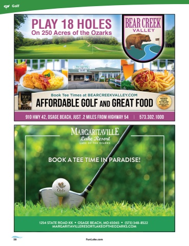 58 FunLake.comGolfPLAY 18 HOLESOn 250 Acres of the Ozarks1254 STATE ROAD KK OSAGE BEACH, MO 65065 (573) 348-8522MARGARITAVILLERESORTLAKEOFTHEOZARKS.COMBOOK A TEE TIME IN PARADISE!
