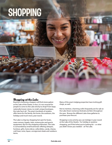 62 FunLake.comShopping at the LakeBuying or browsing, shoppers will find stores galore at the Lake of the Ozarks. In fact, it%u2019s not unusual for people to come to the Lake strictly to shop! From large, nationally known stores, to small, unique boutiques, the Lake has it all. The area%u2019s hundreds of retailers offer items for the family, the home, the outdoors, the holidays and much more, year-round.The Lake is a big-toy shopping hot spot for boats, wave runners, kayaks, 4x4s, motorcycles and sports equipment. But for the shopping enthusiast, The Lake is surrounded by small businesses offering antiques, furniture, gifts, home d%u00e9cor, collectibles, candy, cheese, craft beer, wine, liquor, consignment deals and outdoors items. Many of the area%u2019s lodging properties have inviting gift shops, as well. Not to mention, charming crafts frequently are for sale at the Lake Area%u2019s numerous festivals and fairs throughout the year. Browse the different Lake-Area galleries to purchase your fine art.Shopping is one activity you can indulge in year-round at the Lake of the Ozarks. For holiday or anytime shopping, you%u2019ll find what you%u2019re looking for %u2013 or what you didn%u2019t know you needed %u2013 at The Lake.
