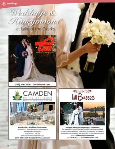 Weddings &Honeymoonsat Lake of the Ozarks70WeddingsYour Perfect Wedding DestinationLuxurious & Comfortable AccommodationsHoneymoon GetawaysFull Service CateringBachelor/Bachelorette Packages(573) 365-5620 %u2022 CamdenOnTheLake.com(573) 346-2676 %u2022 bridalcave.comBoutique Weddings %u2022 Receptions %u2022 ElopementsOur specialty is beautiful and affordable boutique weddings such as brunch weddings, cocktail party weddings, elopements, and traditional weddings. We offer QUICK civil ceremonies too! 7127 Old Route 5 %u2022 Camdenton(573) 836-8133 %u2022 LakeBreezeTerrace.com
