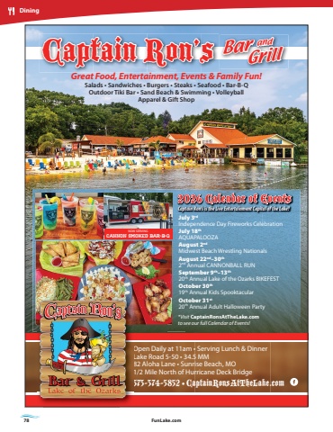78 FunLake.comDiningCaptain Ron%u2019sOpen Daily at 11am %u2022 Serving Lunch & DinnerLake Road 5-50 %u2022 34.5 MM82 Aloha Lane %u2022 Sunrise Beach, MO1/2 Mile North of Hurricane Deck Bridge573-374-5852 %u2022 CaptainRonsAtTheLake.com Great Food, Entertainment, Events & Family Fun!Salads %u2022 Sandwiches %u2022 Burgers %u2022 Steaks %u2022 Seafood %u2022 Bar-B-QOutdoor Tiki Bar %u2022 Sand Beach & Swimming %u2022 VolleyballApparel & Gift Shop2026 Calendar of EventsCaptain Ron%u2019s is the Live Entertainment Capital of the Lake!Bar and Grill*Visit CaptainRonsAtTheLake.comto see our full Calendar of Events!July 3rdIndependence Day Fireworks CelebrationJuly 18thAQUAPALOOZAAugust 2ndMidwest Beach Wrestling NationalsAugust 22nd%u201330th2nd Annual CANNONBALL RUNSeptember 9th%u201313th20th Annual Lake of the Ozarks BIKEFESTOctober 30th19th Annual Kids SpooktacularOctober 31st20th Annual Adult Halloween PartyNOW SERVINGCANNON SMOKED BAR-B-Q