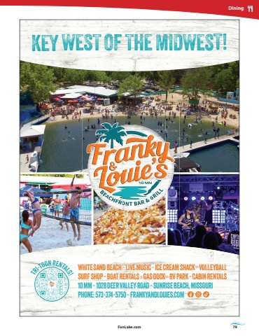 FunLake.com FunLake.com 79DiningKEY WEST OF THE MIDWEST!WHITE SAND BEACH - LIVE MUSIC - ICE CREAM SHACK - VOLLEYBALLSURF SHOP - BOAT RENTALS - GAS DOCK - RV PARK - CABIN RENTALS10 MM - 1028 DEER VALLEY ROAD - SUNRISE BEACH, MISSOURIPHONE: 573-374-5750 - FRANKYANDLOUIES.COM