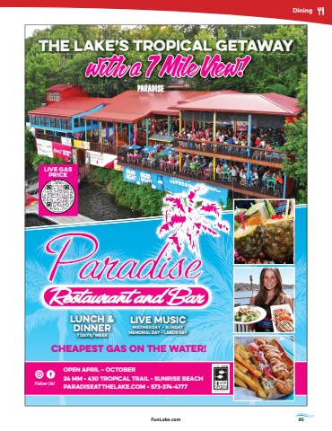 FunLake.com FunLake.com 85DiningThe Lake%u2019s Tropical Getawayw%u0131th a 7 Mile View!Follow Us!live gas priceOPEN April %u2013 OCTOBER24 MM %u2022 430 Tropical Trail %u2022 sunrise Beach Paradiseatthelake.com %u2022 573-374-4777CHEAPEST GAS ON THE WATER!LUNCH & DINNER7 Days/WeekLIVE MUSICWednesday %u2013 SUNDAYMEMORIAL DAY %u2013 LABOR DAY