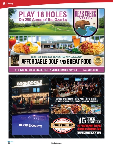 90 FunLake.comDiningNEWLY REMODELED %u2022 NEW POOL %u2022 NEW MENULIVE ENTERTAINMENT %u2022 EVENTS %u2022 DRINK SPECIALSPLAY 18 HOLESOn 250 Acres of the Ozarks