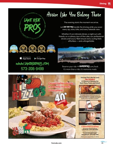 FunLake.com FunLake.com 91DiningServing The Lake for over 40 YEARSLi%u2019l Rizzo%u2019s is famous for their Pizza, Pasta and Salad. 2 Convenient Locations:Horseshoe Bend ParkwayLake Ozark %u2022 (573) 365-3003929 Premium Outlets DriveIn Front of Hobby LobbyOsage Beach %u2022 (573) 302-1500Both Locations Open Daily at 11:00 amOur pizza is the best possible because we make our dough fresh everyday, and use only the freshest hand-cut vegetables and highest quality meats and cheeses available.Visit lilrizzos.com to order your carryout online!Kid Friendly!Casual Italian dining in a family friendly atmosphere!th