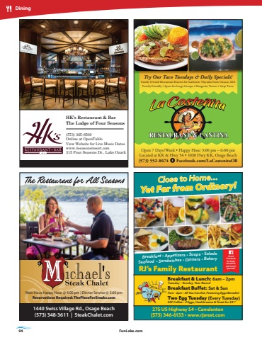 94 FunLake.comDiningCheck Facebook for Daily Breakfast and Lunch Specials!Close to Home...Yet Far from Ordinary!Breakfast %u2022 Appetizers %u2022 Soups %u2022 SaladsSeafood %u2022 Sandwiches %u2022 Dinners %u2022 BakeryBreakfast & Lunch: 6am %u2013 2pmTuesday %u2013 Sunday, Year RoundBreakfast Buffet: Sat & Sun7am - 2pm %u2022 All You Can Eat, Featuring Eggs BenedictTwo Egg Tuesday (Every Tuesday)50%u00a2 Coffee %u2022 2 Eggs, Hashbrowns & Toast for $4.99RJ%u2019s Family Restaurant275 US Highway 54 %u2022 Camdenton(573) 346-6133 %u2022 www.rjsrest.com1440 Swiss Village Rd., Osage Beach(573) 348-3611 | SteakChalet.comWein Haus Happy Hour @ 4:00 pm | Dinner Service @ 5:00 pmReservations Required: ThePlaceForSteaks.comHK%u2019s Restaurant & Bar The Lodge of Four Seasons(573) 365-8509Online at OpenTableView Website for Live Music Dateswww.4seasonsresort.com315 Four Seasons Dr., Lake Ozark Open 7 Days/Week %u2022 Happy Hour 3:00 pm %u2013 6:00 pmLocated at KK & Hwy 54 %u2022 1030 Hwy KK, Osage Beach(573) 552-8674 Facebook.com/LaCostenitaOBTry Our Taco Tuesdays & Daily Specials!Family Owned Restaurant Known for Authentic Tlayudas from Oaxaca, MXFamily Friendly %u2022 Space for Large Groups %u2022 Margarita Towers %u2022 Strip Tacos